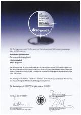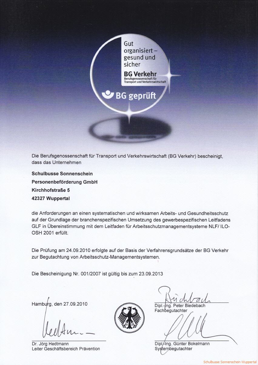 In dieser wiederholten Prüfung hat die BG Verkehr festgestellt, das wir weiterhin die Anforderungen an einen systematischen und wirksamen Arbeits- und Gesundheitsschutz erfüllen. Die auf drei Jahre befristete Bescheinigung wurde bis September 2013 verlängert.